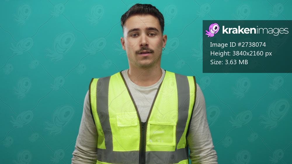Young hispanic man in reflective vest stands against isolated green wall background looking pensive and calm.