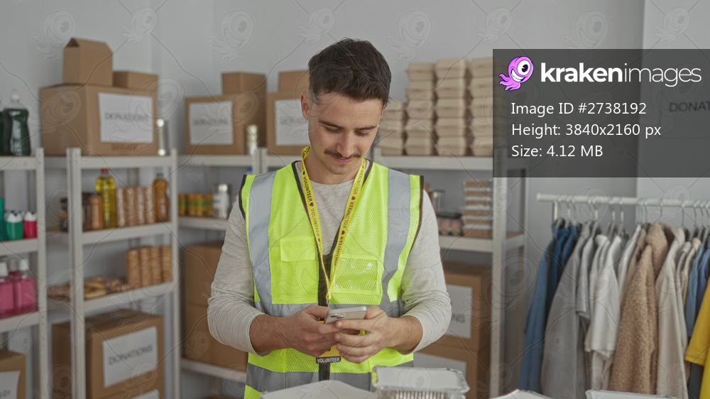 Young hispanic man in reflective vest takes a selfie at an indoor charity center filled with donations, surrounded by organized boxes and clothing racks. - Kraken Images