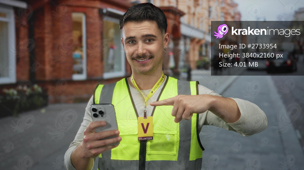 Young hispanic man in reflective vest using smartphone on city street as a volunteer, focused and surrounded by urban ambiance.