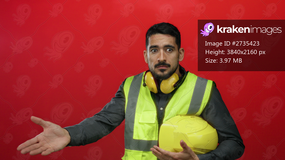 Young hispanic man in safety vest holding helmet and headphones against a red background, looking concerned and expressive in portrait framing