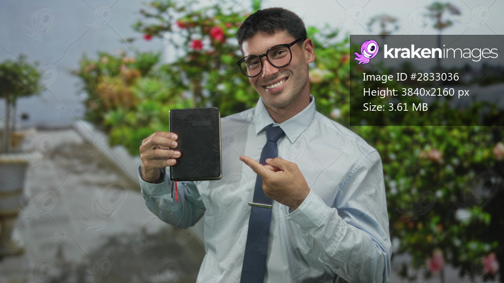 Young hispanic man in shirt and tie smiling and pointing finger to notebook on street near plants; optimism.