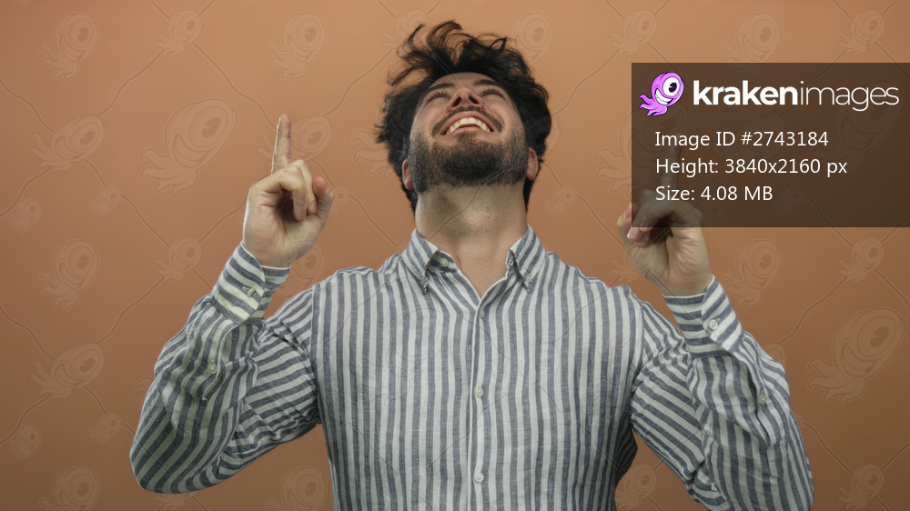 Young hispanic man in striped shirt joyfully points upwards against orange background, exuding happiness and excitement.