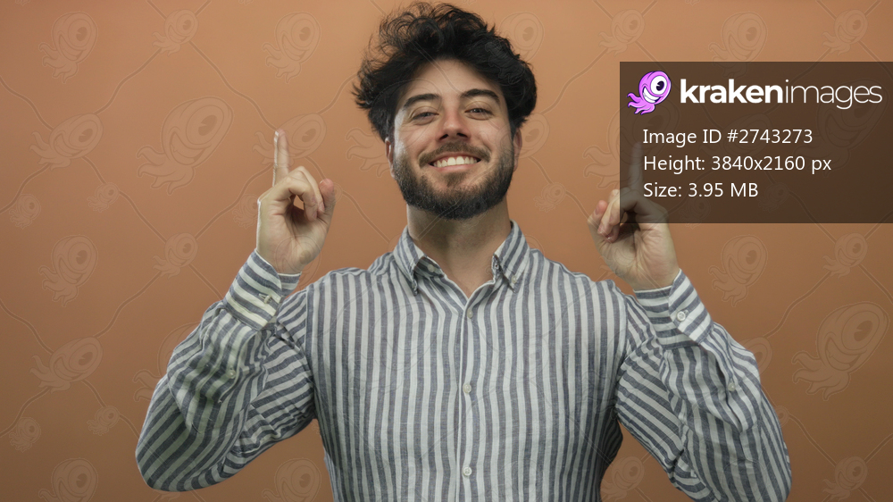 Young hispanic man in striped shirt joyfully points upwards against orange background, exuding happiness and excitement.