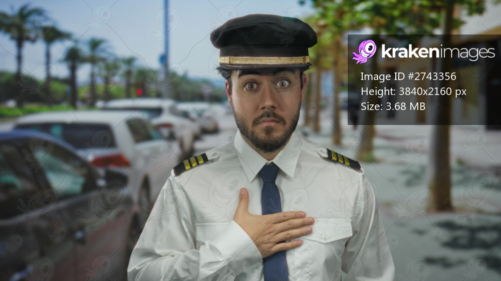 Young hispanic man in uniform with a beard stands on a street, palms in background, expressing surprise outdoors.