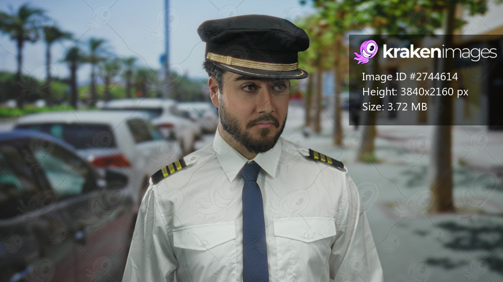 Young hispanic man in uniform with a beard stands on a street, palms in background, expressing surprise outdoors.