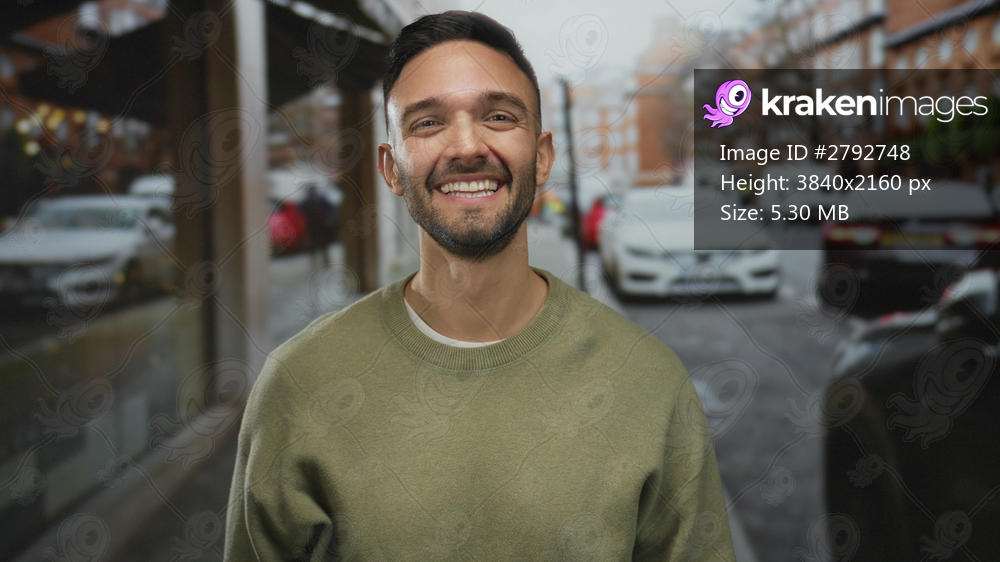 Young hispanic man in urban city street outdoors giving thumbs up while smiling and looking to the side with blurred cars and buildings in the background - Kraken Images