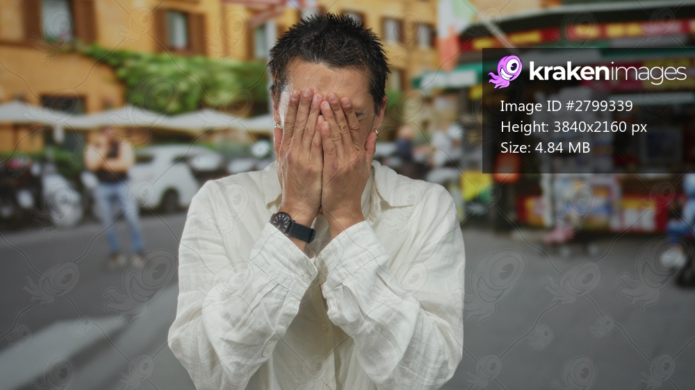Young hispanic man in urban street with blurred background wearing white shirt making expressive gestures outdoors in city setting with cars and scooter in view. - Kraken Images