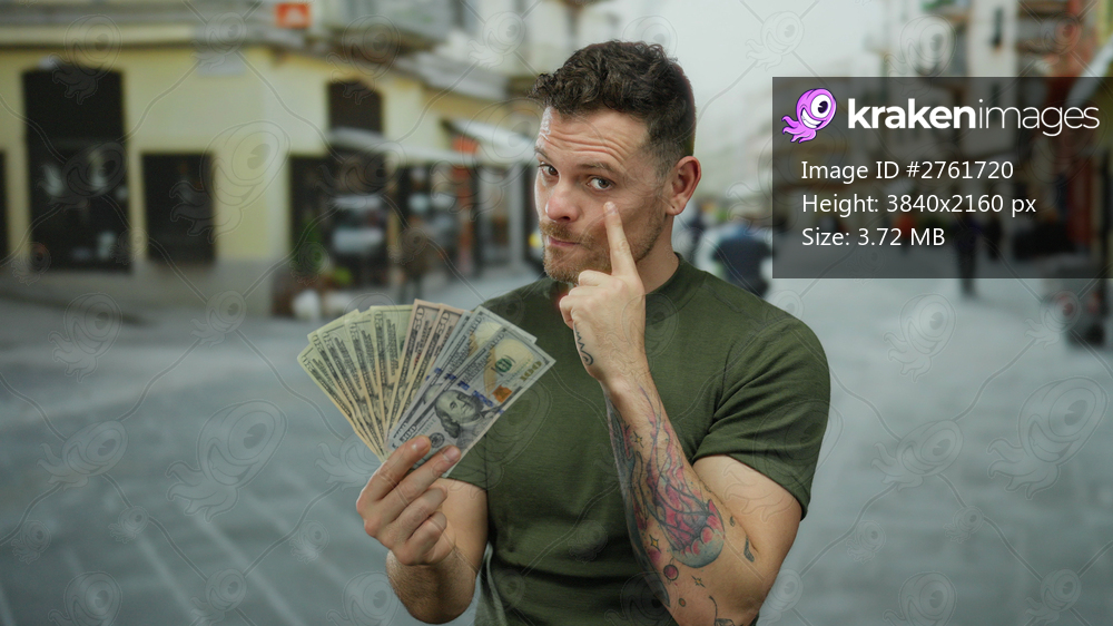 Young hispanic man in urban street holds american dollars while making a finger gesture, portraying confidence and awareness in an outdoor city setting. - Kraken Images