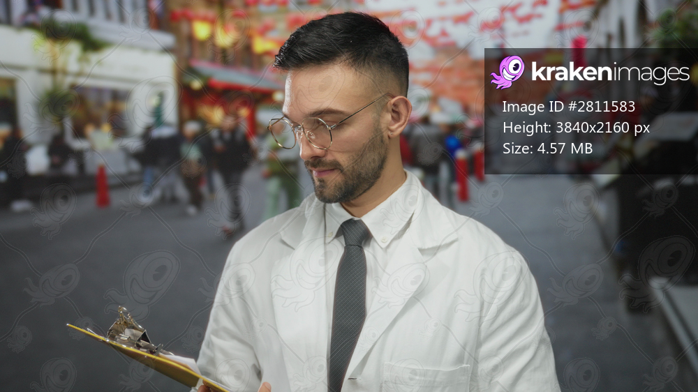 Young hispanic man in white coat holding clipboard, standing in vibrant urban street with bustling city backdrop.