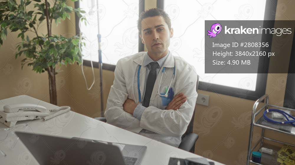 Young hispanic man in white doctor uniform with stethoscope crosses arms in bright clinic room; rejection.