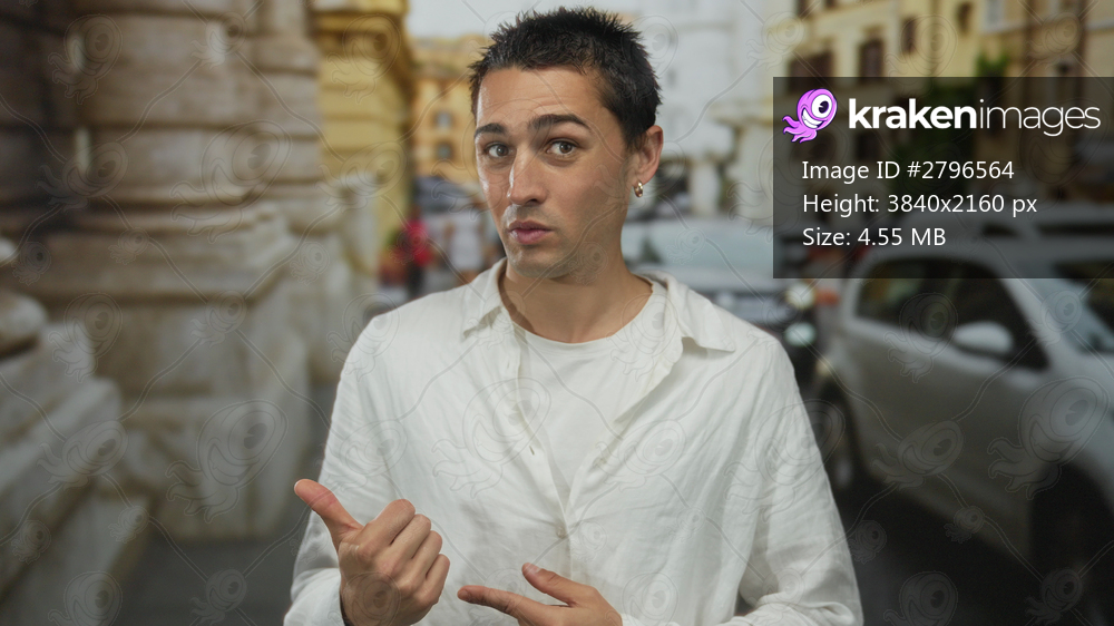 Young hispanic man in white linen shirt points thumb to sunlit narrow historic street behind him; doubt.