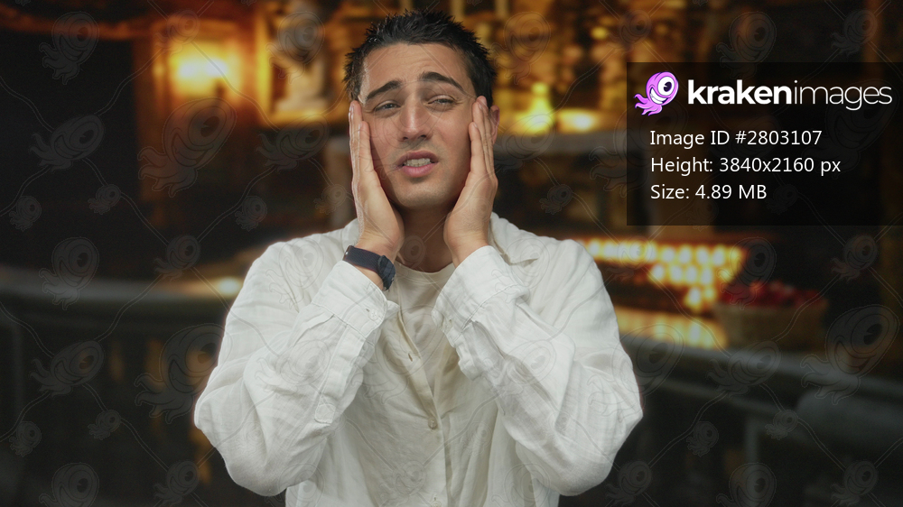 Young hispanic man in white linen shirt pressing temples in church interior under soft candlelight; concern.