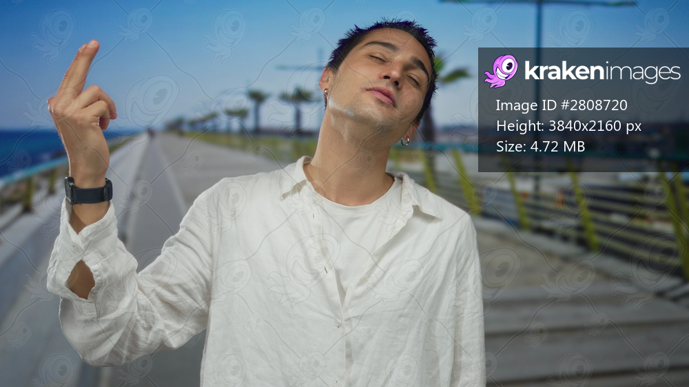 Young hispanic man in white shirt aims finger gun to his temple on a sunny seaside promenade; frustration.