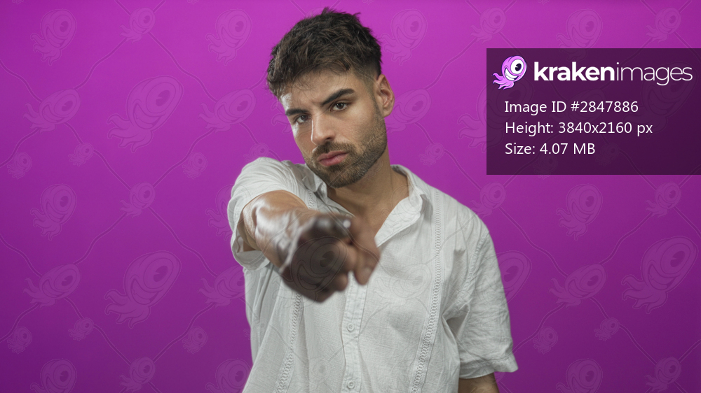 Young hispanic man in white shirt beckons with extended finger in vibrant magenta studio setting; invitation call.