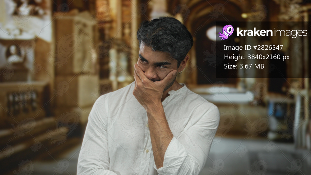 Young hispanic man in white shirt covers mouth with hand in ornate church building interior; remorse reflection.