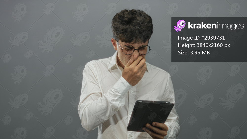 Young hispanic man in white shirt and glasses holding tablet pinches nose in grey studio; odor disgust.