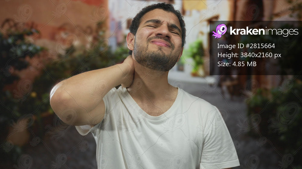Young hispanic man in white shirt with hand on neck and grimacing expression on sunlit cobbled old town street; discomfort.
