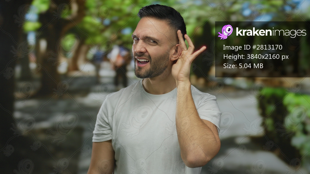 Young hispanic man in white shirt listens attentively in a vibrant green park setting under soft sunlight with trees casting shadows on the path.