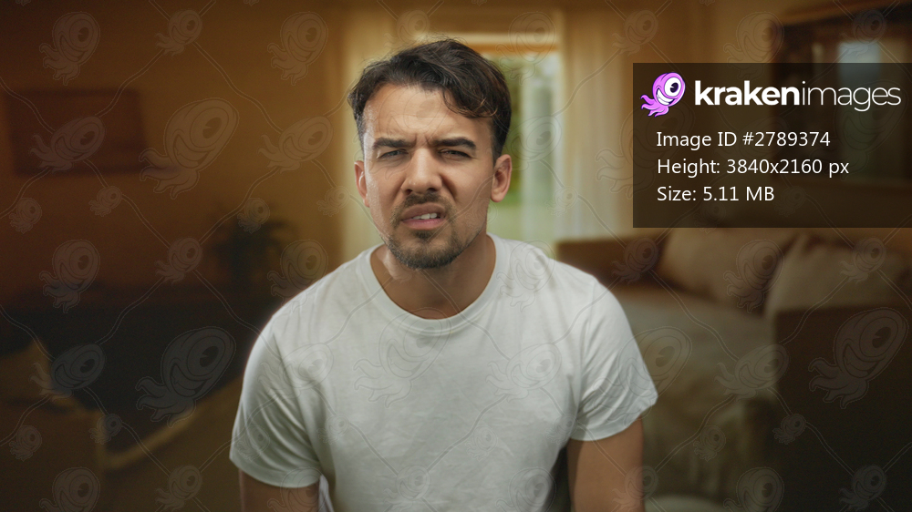 Young hispanic man in white shirt looks curious in a cozy indoor room with beige decor and a soft sofa creating a relaxed atmosphere.