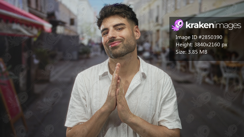 Young hispanic man in white shirt with neatly trimmed beard presses hands together in bustling city street; confidence.