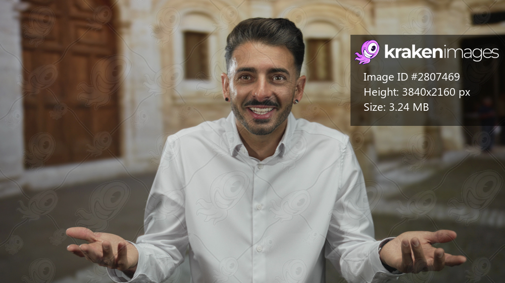 Young hispanic man in white shirt with palms up gesture in old town street flanked by stone building facade; uncertainty.