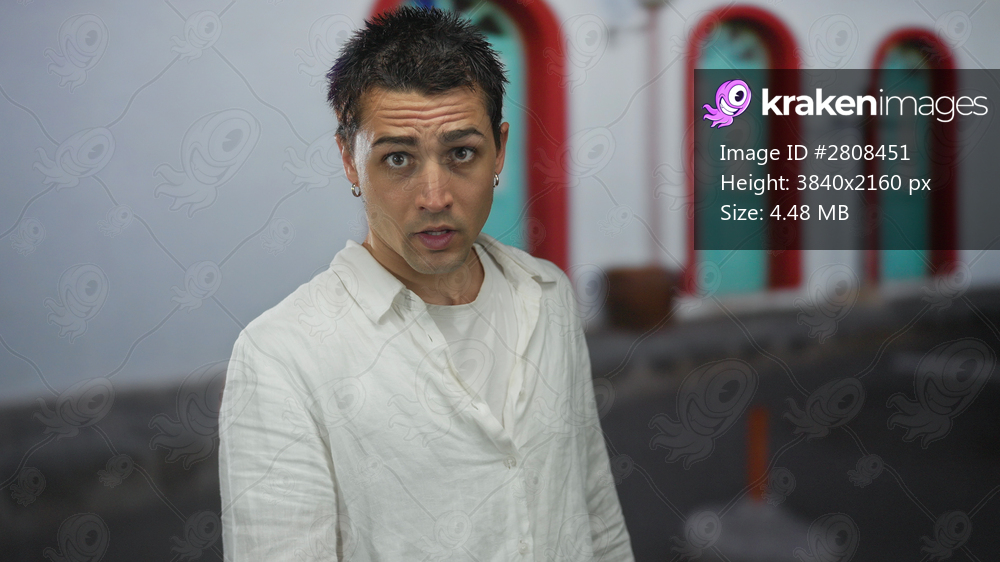 Young hispanic man in white shirt pointing finger to camera on sunny street; anger defiance confrontation.