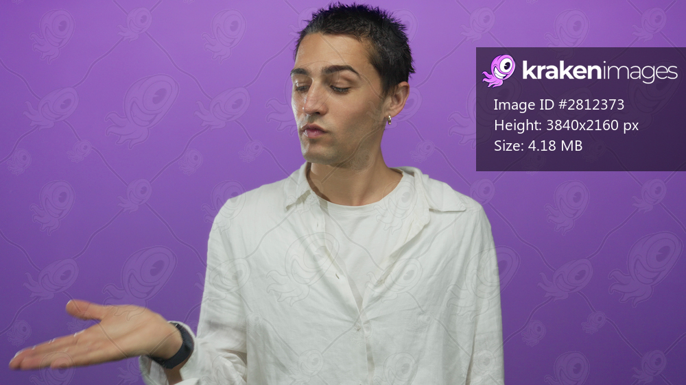 Young hispanic man in white shirt pointing finger to palm in purple studio; point highlight curiosity.