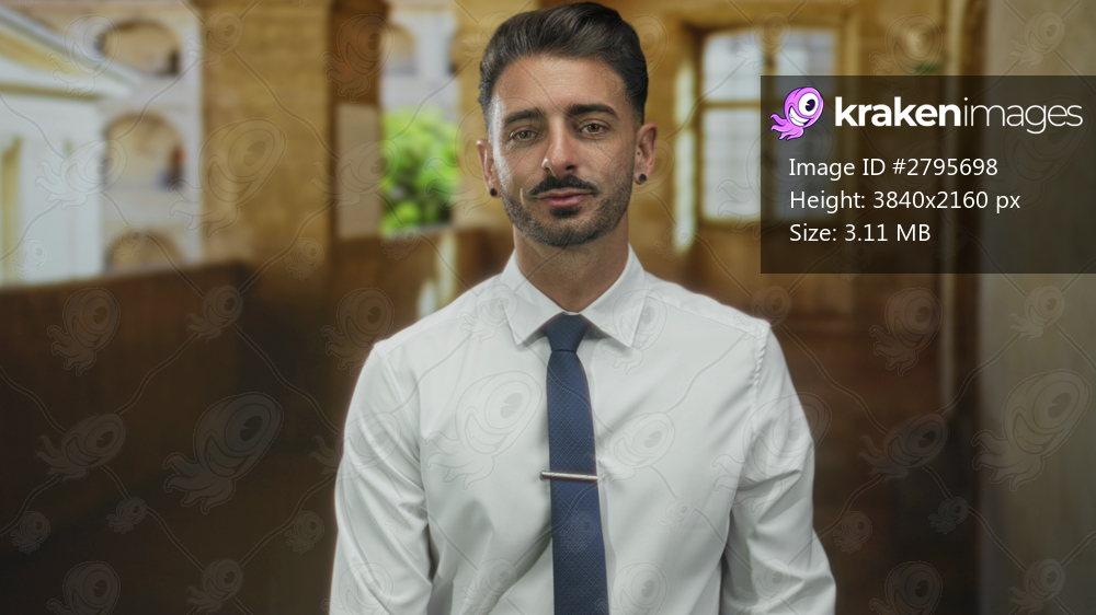 Young hispanic man in white shirt pointing hand inside sunlit building corridor; invitation confidence.