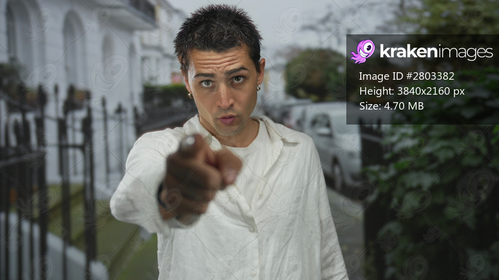 Young hispanic man in white shirt points finger on street lined with townhouses; anger confrontation.