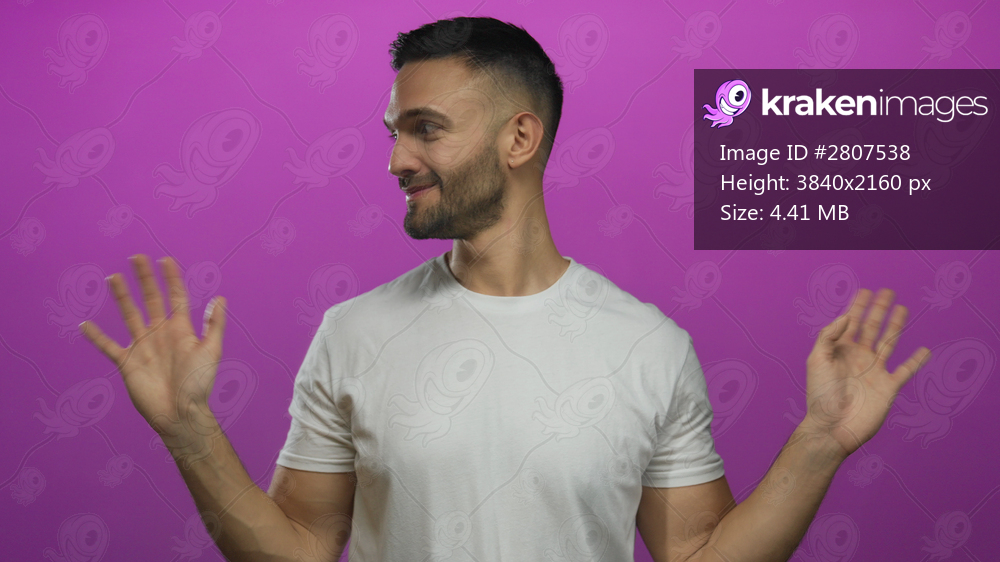 Young hispanic man in white shirt posing playfully against vibrant pink background with joyful expression and open arms captured in studio setting.