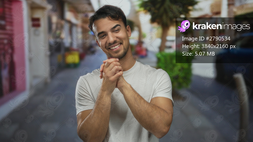 Young hispanic man in white shirt showing gratitude on a vibrant city street outdoors.