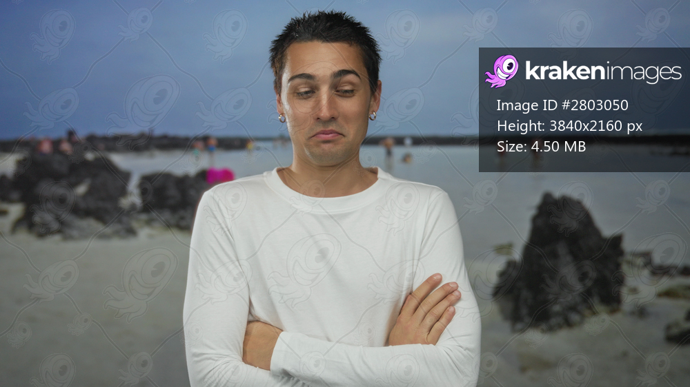 Young hispanic man in white shirt stands at a beach background with rocks, expressing mixed emotions, captured outdoors in a seaside setting.