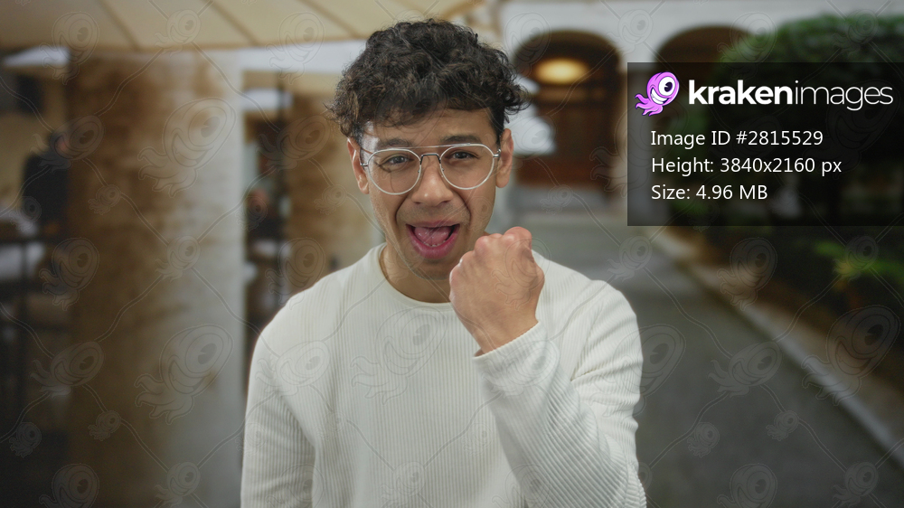 Young hispanic man in white sweater clenches fist near stone columns in building courtyard with green foliage; determination.