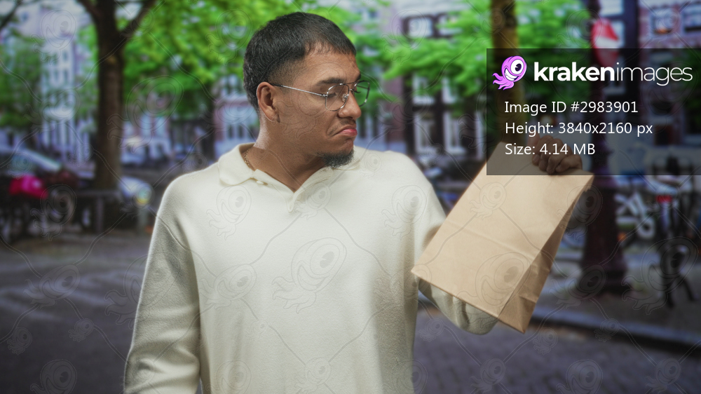 Young hispanic man in white sweater holding a paper bag with hands, opening it on a street; anticipation.