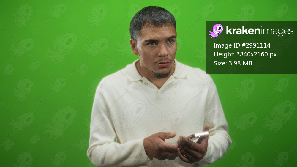 Young hispanic man in white sweater holding smartphone and tapping screen in green screen studio; contemplation.