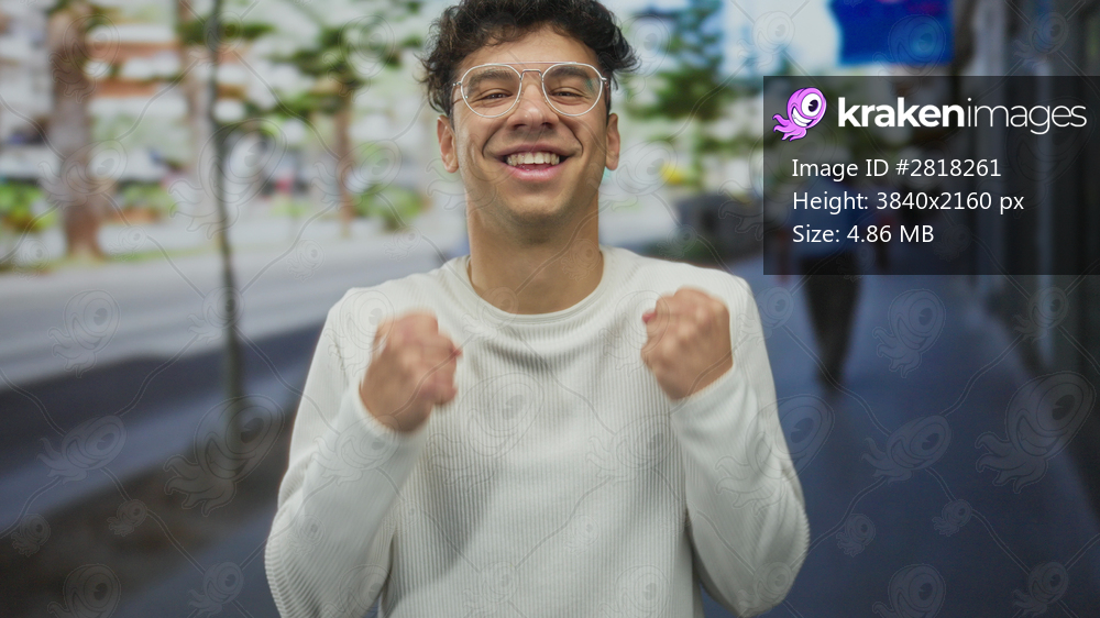 Young hispanic man in white sweater with round glasses clenches fists on sunlit street sidewalk; excitement.