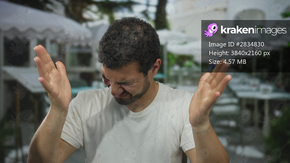 Young hispanic man in white t shirt grimacing covers ears with hands on street under bright sunlight; pain.