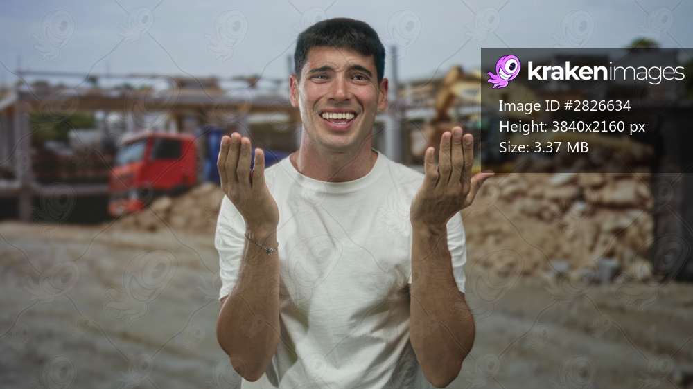 Young hispanic man in white t-shirt holds head with both hands in front of red dump truck at outdoor building site; stress.