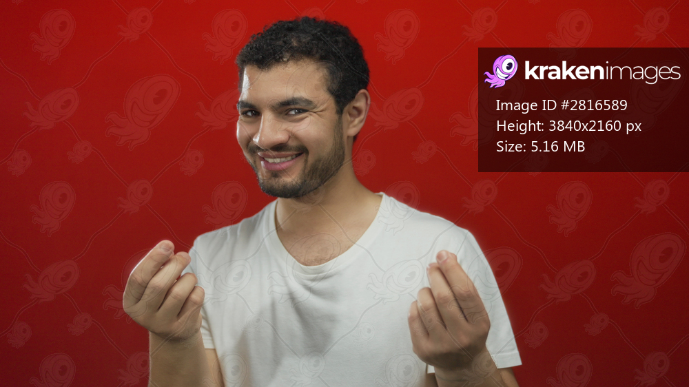 Young hispanic man in white t shirt pinches fingertips with both hands in red studio; request question.