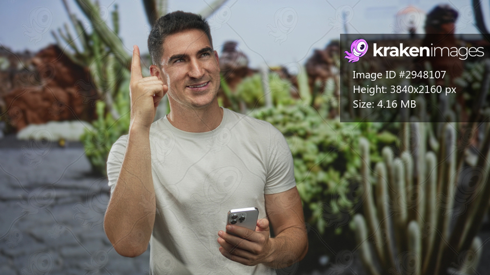 Young hispanic man in white t shirt points finger up while holding smartphone in studio with cactus mural and stone path; curiosity discovery.