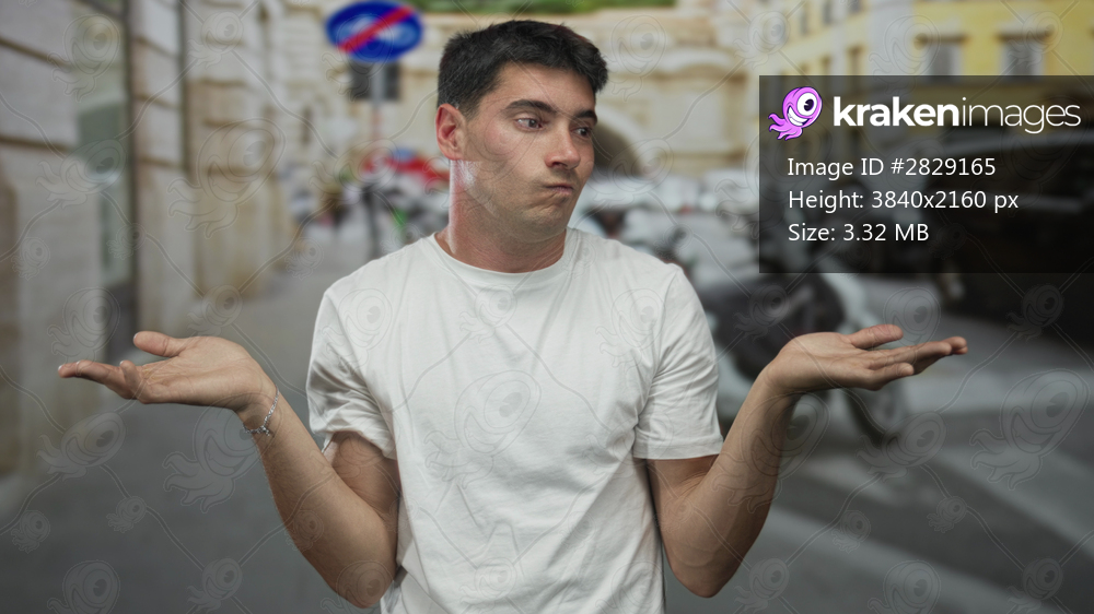 Young hispanic man in white tee shrugging with open palms among scooters and buildings on street; uncertainty.
