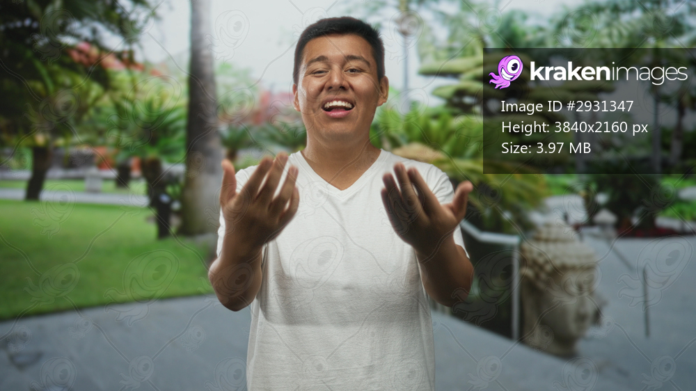 Young hispanic man in white tshirt pointing with both index fingers and showing open palms toward camera in forest walkway; welcoming invitation.