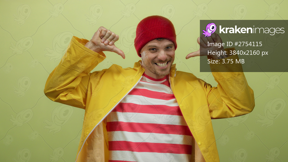Young hispanic man in yellow raincoat and red beanie pointing thumbs at himself against a yellow background conveying confidence and self-assurance with a smile. - Kraken Images