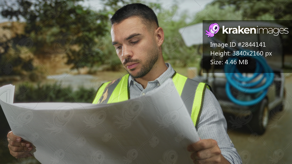 Young hispanic man in yellow safety vest holds unfolded technical blueprint in lush forest; planning focus.