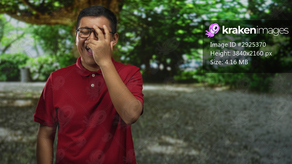 Young hispanic man laughing, covering his face with his hand while adjusting glasses, wearing a red polo shirt, standing on a tree shaded pathway in a forest; joy. - Kraken Images
