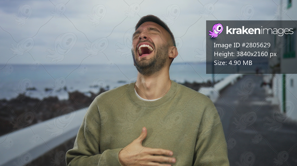 Young hispanic man laughing joyfully on seaside promenade with ocean backdrop, showcasing a relaxed outdoor scene filled with happiness and tranquility at the beach. - Kraken Images