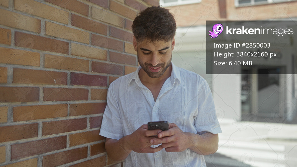 Young hispanic man leaning on brick wall holding smartphone while looking at screen on city street; focus.