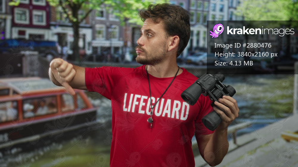 Young hispanic man lifeguard holding binoculars and whistle, showing thumb down gesture on street by a canal with buildings behind him; safety alert.