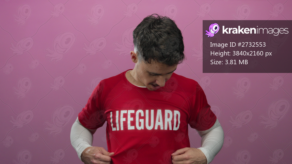 Young hispanic man lifeguard in red t-shirt smiling confidently against a vibrant pink background, representing safety and style in a modern context.