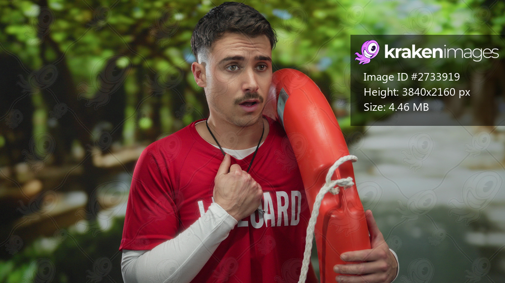 Young hispanic man lifeguard wearing red shirt holding buoy standing outdoors in sunny park looking concerned.